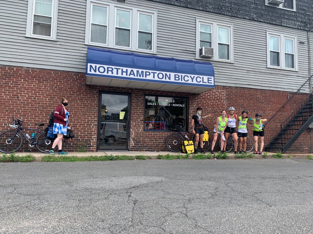 Soon we made it to Northampton, and immediately stopped at a bike shop because I have no control over my bike now that she has panniers and I dropped her at the ice cream place, which tilted my handlebar a bit. We stopped at Northhampton Bike Shop, where they fixed my bike for FREE and we met a really nice girl named Ryse, who recommended a swimming hole for us to stop at a few miles away. Mary Kate got a rainbow bike shirt at the store that looks amazing and she is VERY excited about.