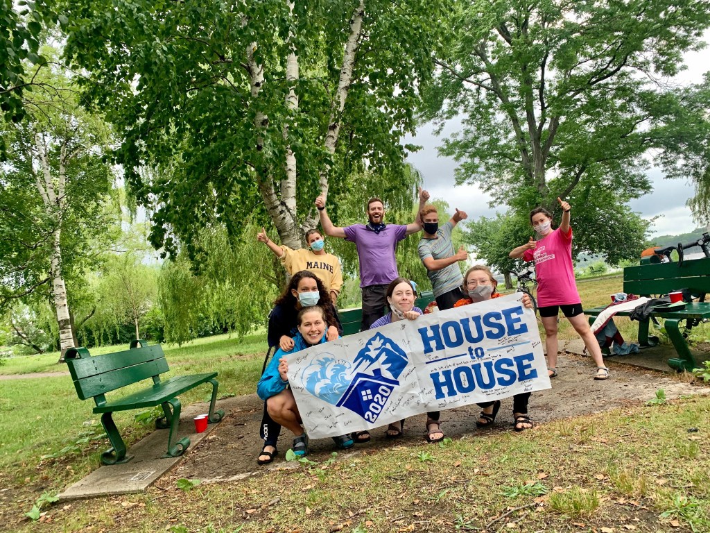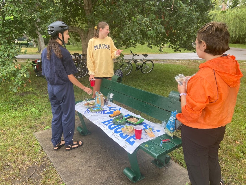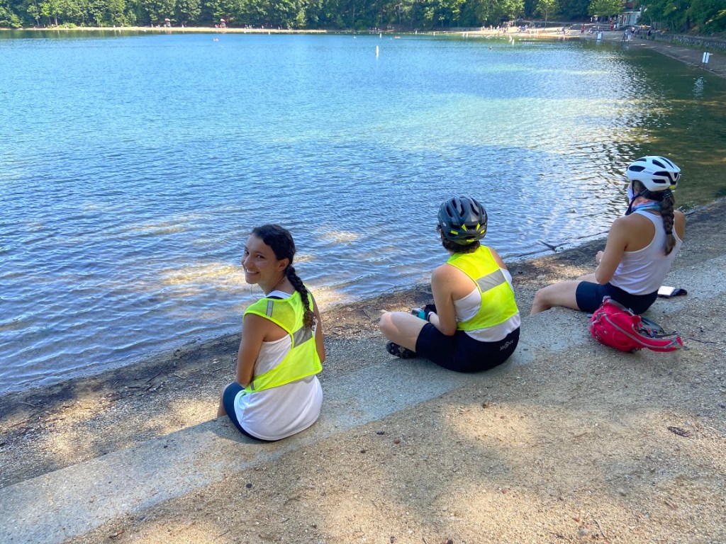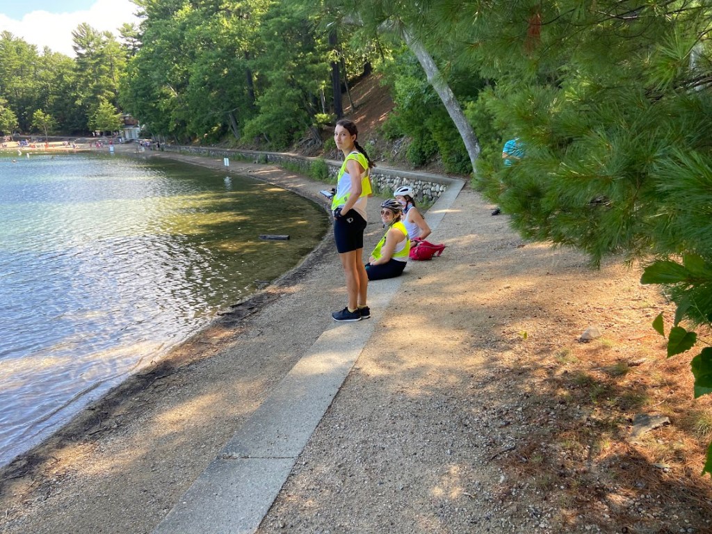 What a fun and relaxing day today! We slept well on Caroline’s cushy grass in her yard and she treated us to a nice, wholesome breakfast of Cheerios, nature valley bars, bananas and peanut butter. She biked with us to Walden Pond, and the five of us wanted to stop at a cute coffee shop in Concord but sadly they were all closed. I had a zoom at 10 which conveniently lined up with when we arrived at Walden, so everyone patiently waited for me and gazed out at the pond. It was beautiful! Lots of open water swimmers which I loved to see.
