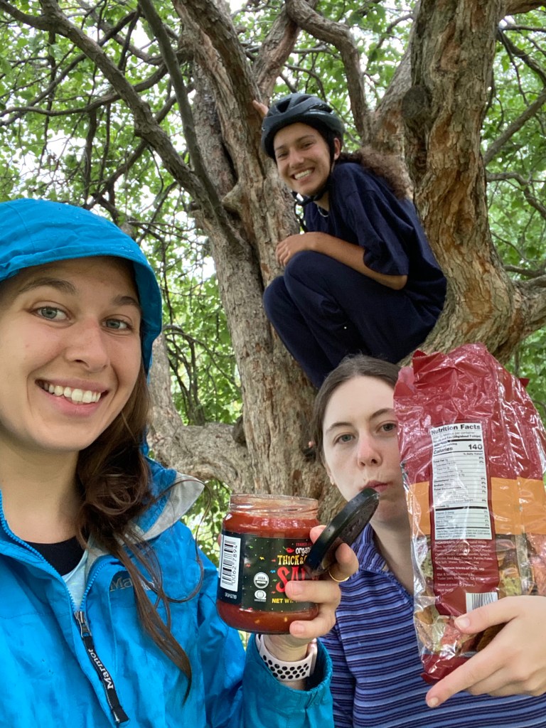 The Espanade is a beautiful place next to the Charles that has lots of paved trails to run and lots of geese. It started raining once we got there, so we took shelter under a tree, which I climbed as soon as we parked our bikes. We devoured a bag of chips and salsa as we waited for the rain to pass. Soon, one of my best friends, Nikki, was there, with more Trader Joe’s treats! It was so amazing to see her. Some of Sarah’s friends came too, and we all enjoyed our Trader Joe’s haul and each other’s company.