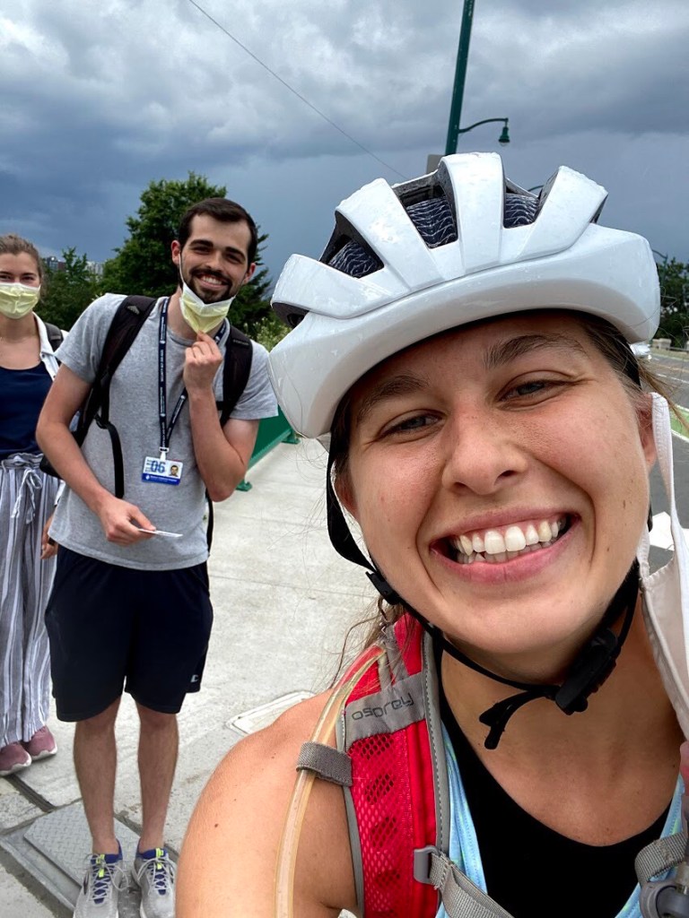 After a while at the pond we parted ways with Caroline. It really was so amazing to meet her and become friends with her! We traveled over some rolling hills that were sneakily a bit hard! But soon we made it to the minute man bike trail, which was pleasant. We had a snack break and gave Sarah’s friend J.D. our lunch orders for him to pick up for us when we met him in Boston. Once we got off the bike path, Sarah led us to her old stomping grounds from her two years working in Boston prior to med school. It was really cool to bike in a city! They had a little bike lane which was convenient.