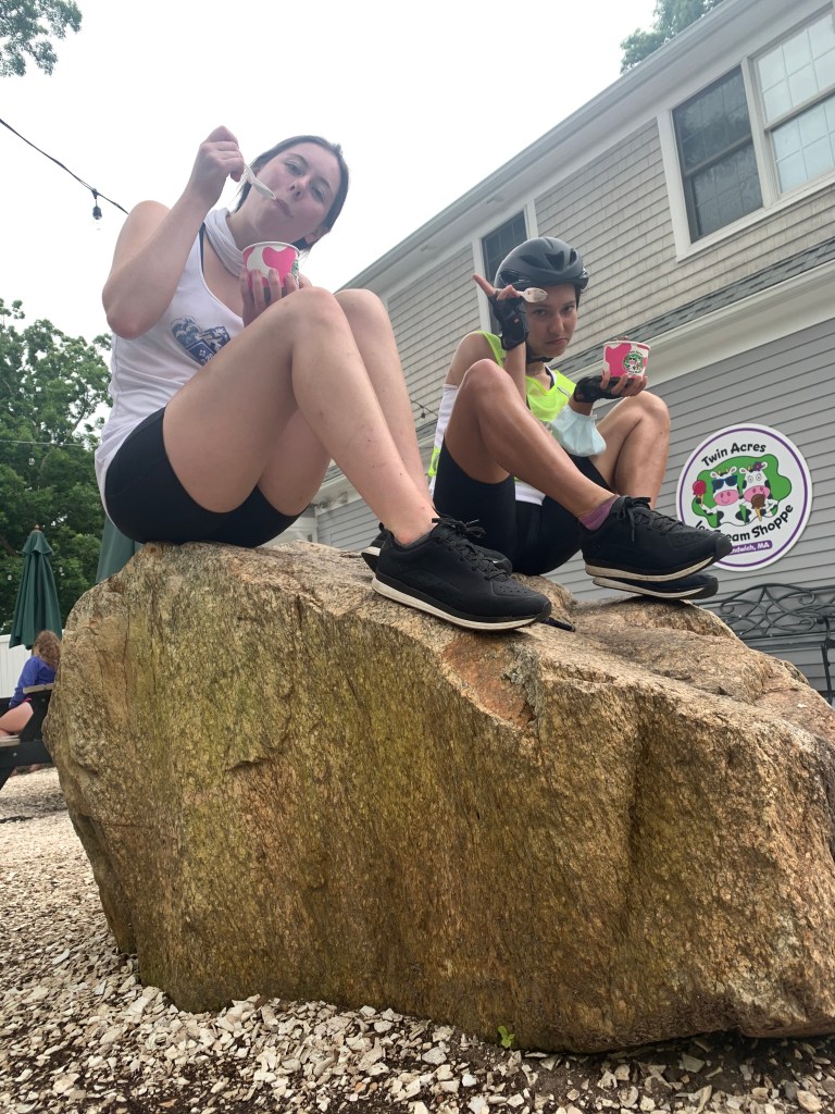 About halfway through the day, we stopped at a bike shop so MK could purchase a bikers bib to reduce the digging in by bike shorts that quite commonly plagues us. Shortly after the shop we rejoined car trafficked roads with rolling hills and made our way to Sandwich. We stopped for our obligatory afternoon ice cream and met Sarah’s aunt and uncle.