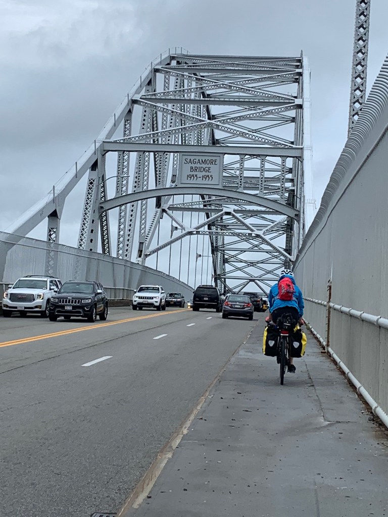 After a chat and photo op in Sandwich, we set out for our last 12 miles. We crossed the monstrosity that is the Sagamore Bridge. Luckily there was a four foot wide walking/bike path raised a foot or so off road, so we were safe from aggressive Masshole drivers.