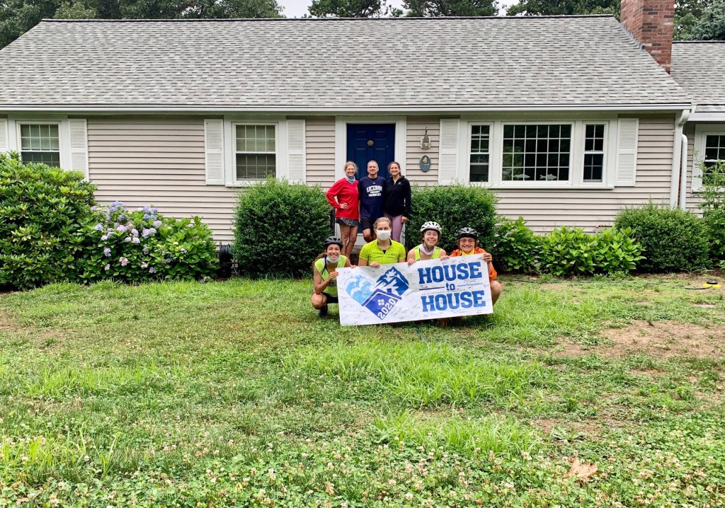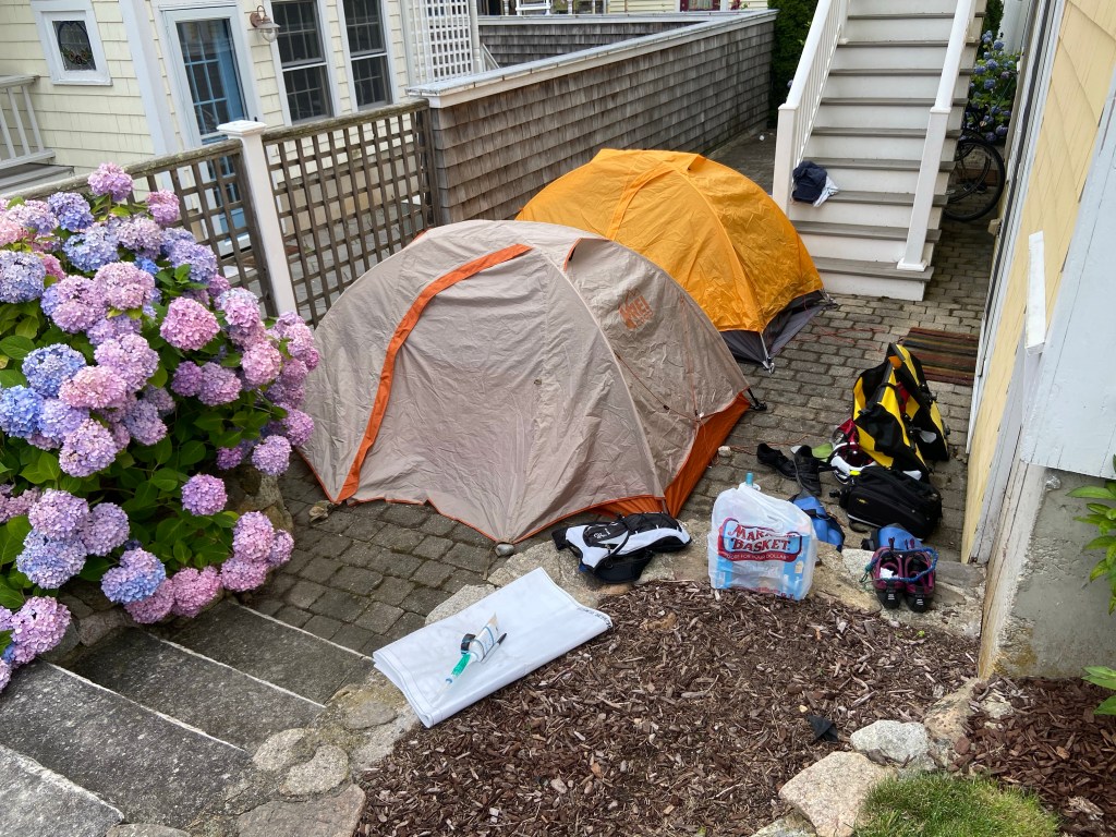 After biking all day with soggy feet, we stripped off our shoes and socks. We ran down the street fully clad in bike shorts and sport bras. Grandma Joyce, Papa Dick, and Uncle Jeff were certainly surprised by the strange sight as four grown women frolicked into the bay. We swam around just for a moment and returned to shower and set up camp. Within minutes our bags, as usual, exploded onto the patio.