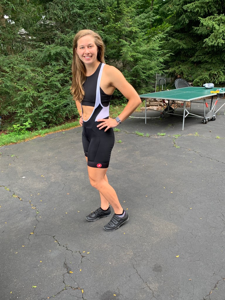 Hugs MK’s body and doesn’t move at all. Any type of shorts with padding is a must, but, compared to shorts, a bib causes less chafing and less pressure on the tummy—- all good things. MK picked this one up at a cycling store on the Cape.