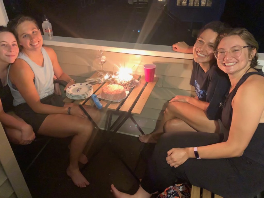 It felt great to finally make it to Caroline’s house! It felt like we had done more than 56 miles. But once we showered, we felt completely refreshed. Caroline fed us an amazing dinner of roasted veggies and their mom’s chicken recipe. As usual we inhaled it. Arguably the best part was dessert. She got us two ice cream cakes!! We put sparklers in them and it was beautiful. We had an great time talking on the porch and eating the delicious food she made us.
